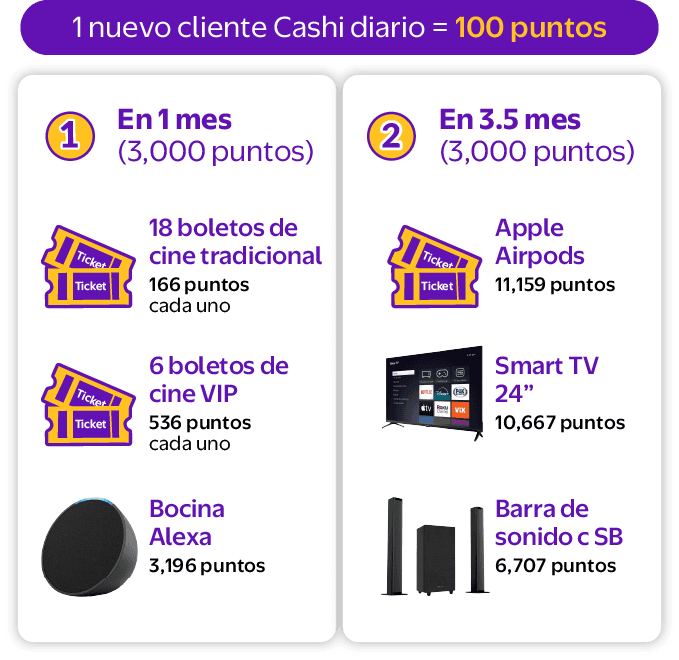 5 puntos por cada cliente que no tiene Cashi y lo des de alta desde POS con su número de celular o descargando la aplicación desde tú código QR.